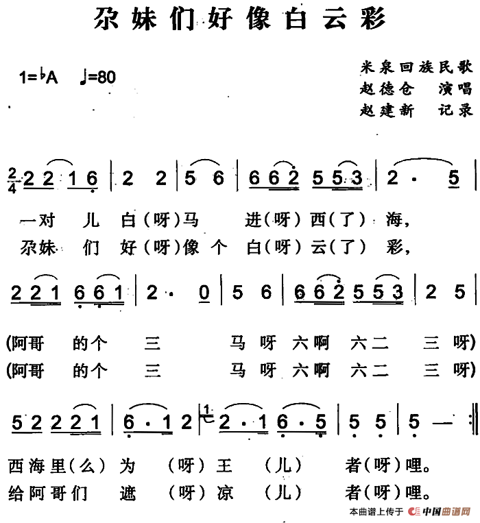 尕妹们好像白云彩(米泉回族民歌)相关五线谱