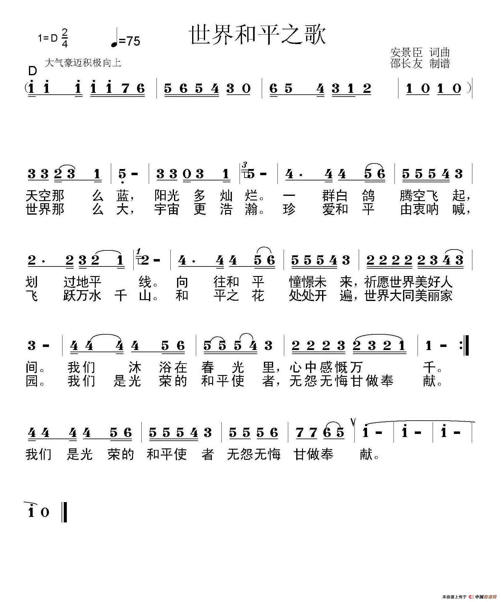 世界和平之歌(安景臣词 安景臣曲)相关五线谱