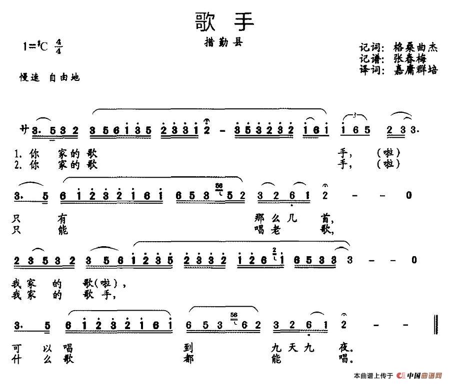 歌手(西藏措勤县民歌)相关五线谱