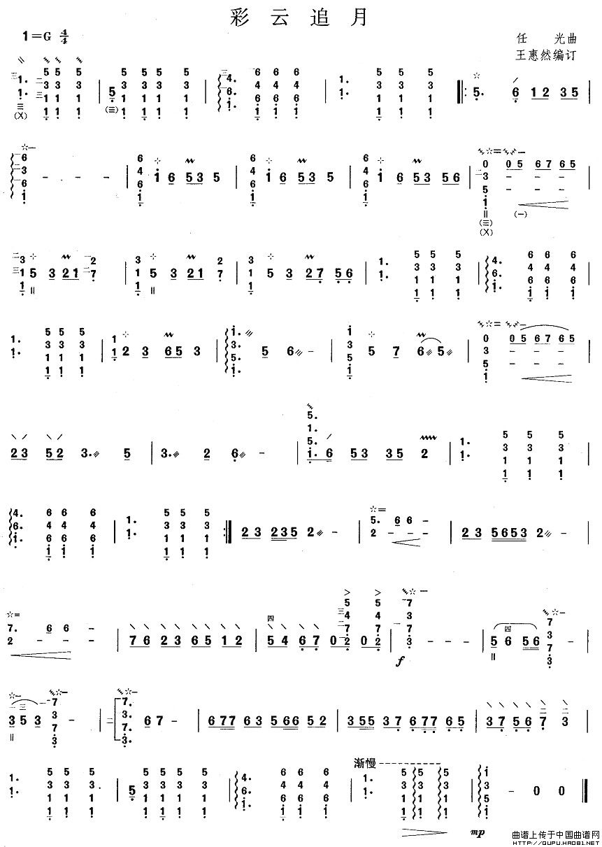 任光曲谱推荐游击队之女(影片《东亚之光》主题歌)彩云追月(笛子初级乐曲)运河搬煤歌(歌剧《洪波曲》选曲之一)彩云追月(中阮、大阮与笛子主旋合成谱)劳动节歌大地行军曲(电影《空谷兰》插曲)彩云追月(箫、琵琶二重奏)彩云追月(民乐合奏)儿童手风琴曲:彩云追月渔光曲(带歌词、提示版)渔光曲春之恋歌(故事影片《母性之光》插曲)考级七级曲目:彩云追月母性之光(故事影片《母性之光》主题歌)采莲歌(安娥词 任光曲)落叶(安娥词 任光曲)三万歌(祝新安旅行团三周年纪念)王老五彩云追月(高胡、二胡与笛子主旋合成谱)彩云追月