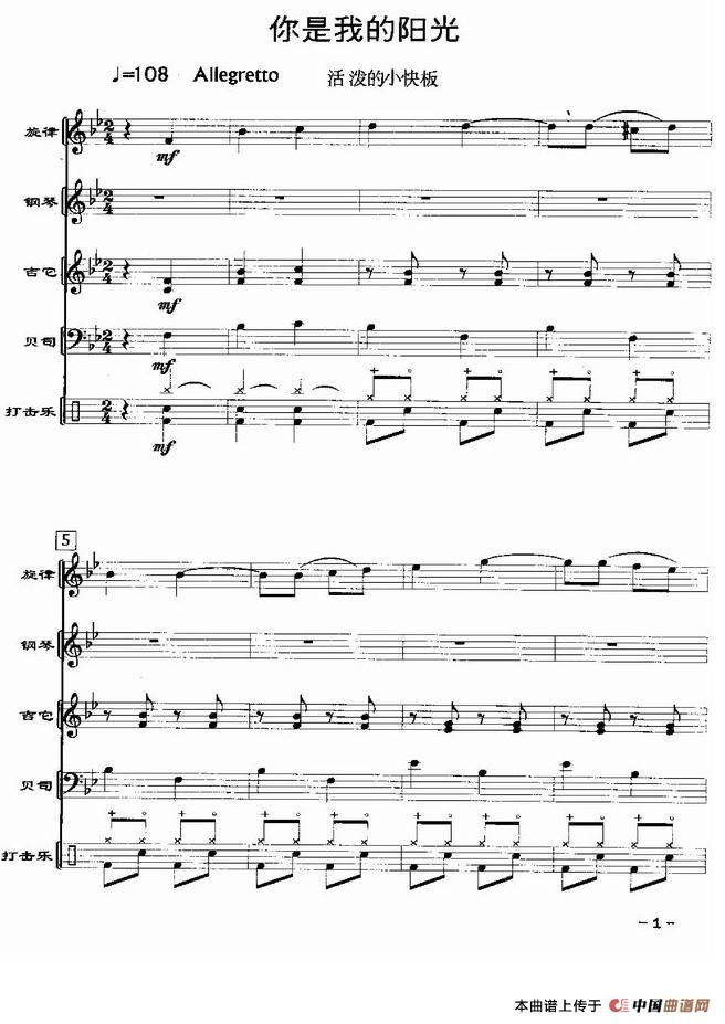 你是我的阳光(电声乐队总谱)相关五线谱