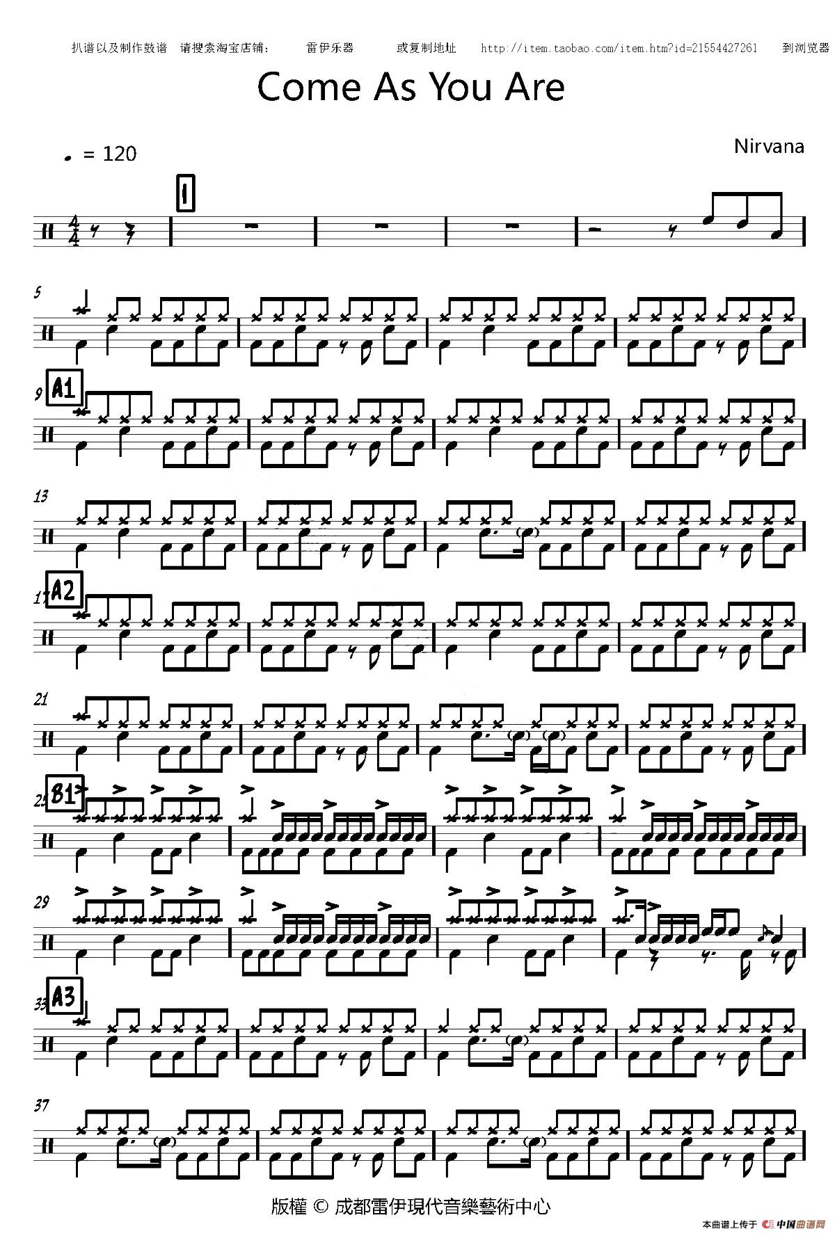 Come as you are(专业鼓谱)相关五线谱