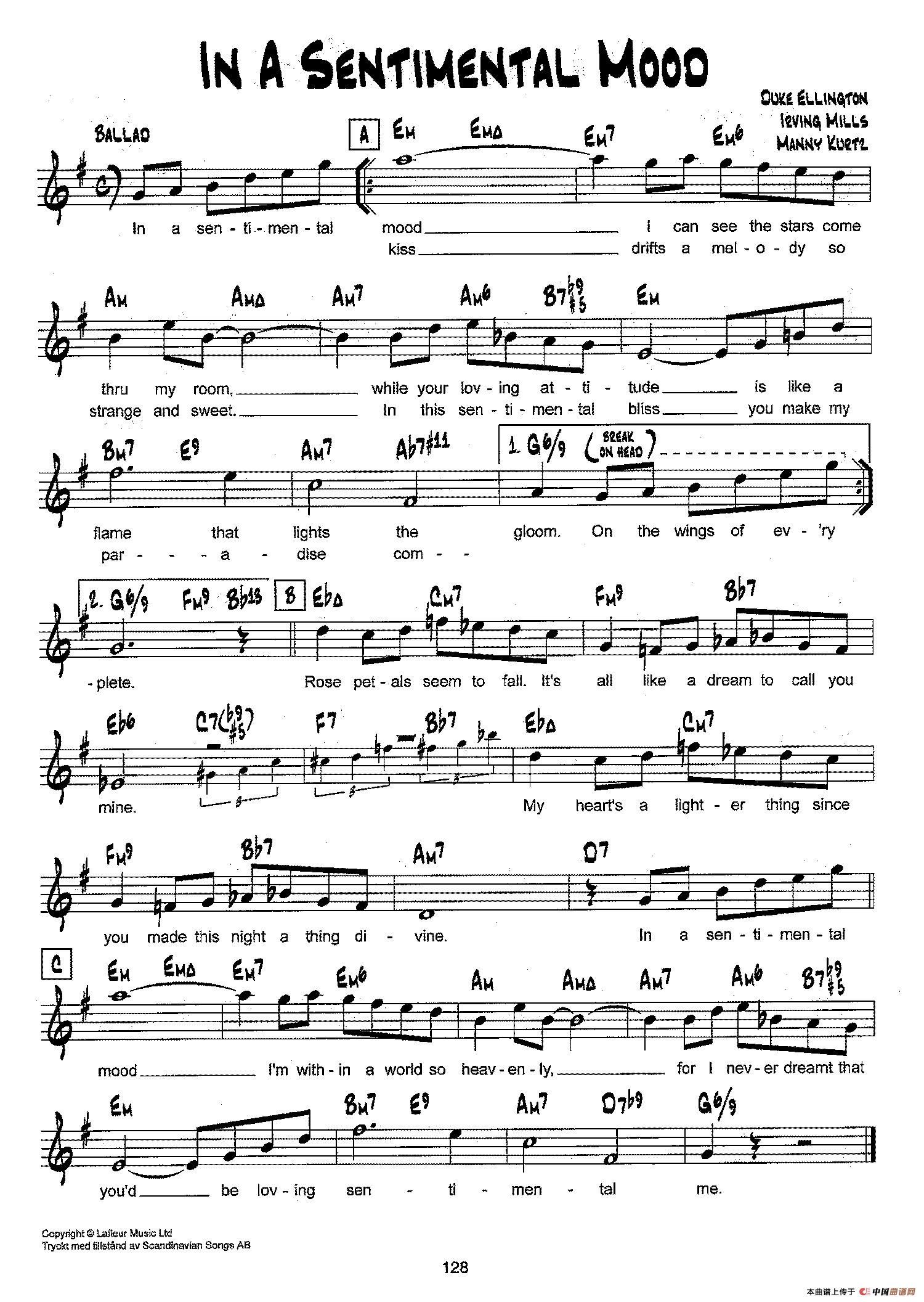 降B爵士乐谱:IN A SENTIMENTAL MOOD