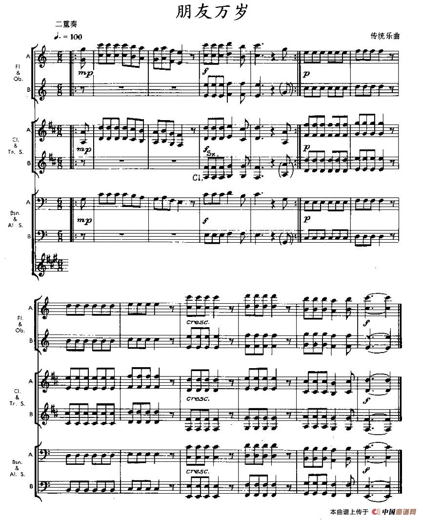 朋友万岁(木管乐器二重奏)相关五线谱