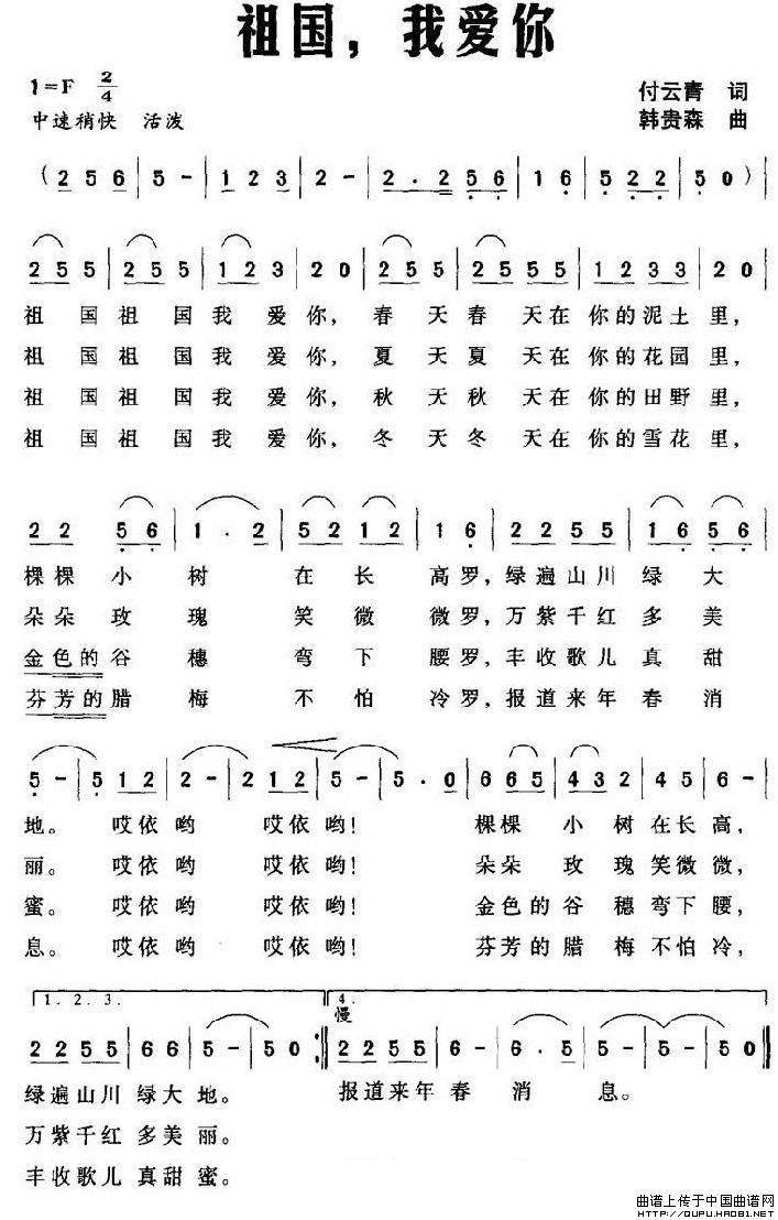 韩贵森曲谱推荐金色的芦笙吹起来(合唱)布依春早请到侗乡做客来美丽强大的祖国水家斗牛乐(独唱+伴唱)我让小树喝个够山村教师多快活春满彝山美丽的侗乡(葫芦丝独奏)丝路随想曲(单簧管+钢琴伴奏)布谷伴我走华桥美丽的侗乡(儿童歌曲)红叶书签美丽的侗乡(阮居平词 韩贵森曲)欢迎你到贵州来布谷伴我走花桥中华小儿郎打水漂