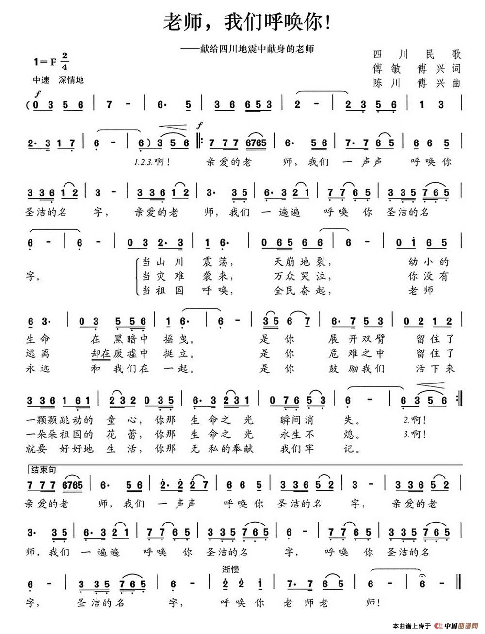 老师,我们呼唤你(献给四川地震中献身的老师)相关五线谱