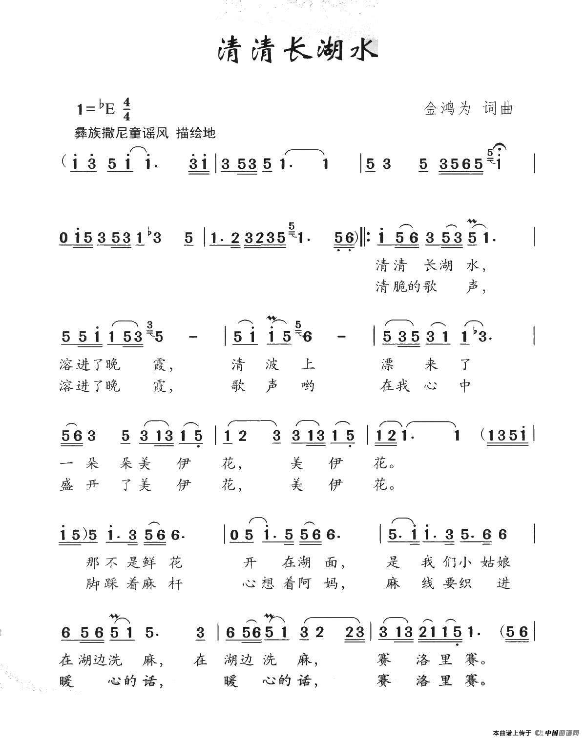 金鸿为曲谱推荐战士 小树 蘑菇我们是祖国的花朵(金鸿为 词曲)星夜,我们去背吉祥水(金鸿为词曲)甩起来 敲起来祝福妈妈(云剑词 金鸿为曲)小路尽头是哨所(刘福波词 金鸿为曲)祝福祖国阿妈啦怒家小姑娘人间仙境长白山(金鸿为词 金鸿为曲)雪山下有座洁白的帐房军歌我们天天唱草原的姑娘阿依夏阿妹的吊脚楼(廖泽川词 金鸿为曲)我的家乡乌鲁木齐高原彩虹飞起来漫一曲“花儿”,喊一声宁夏弹起我心爱的月琴小平的英明世代颂扬木鼓新歌(禹崇全词 金鸿为曲)家有多好