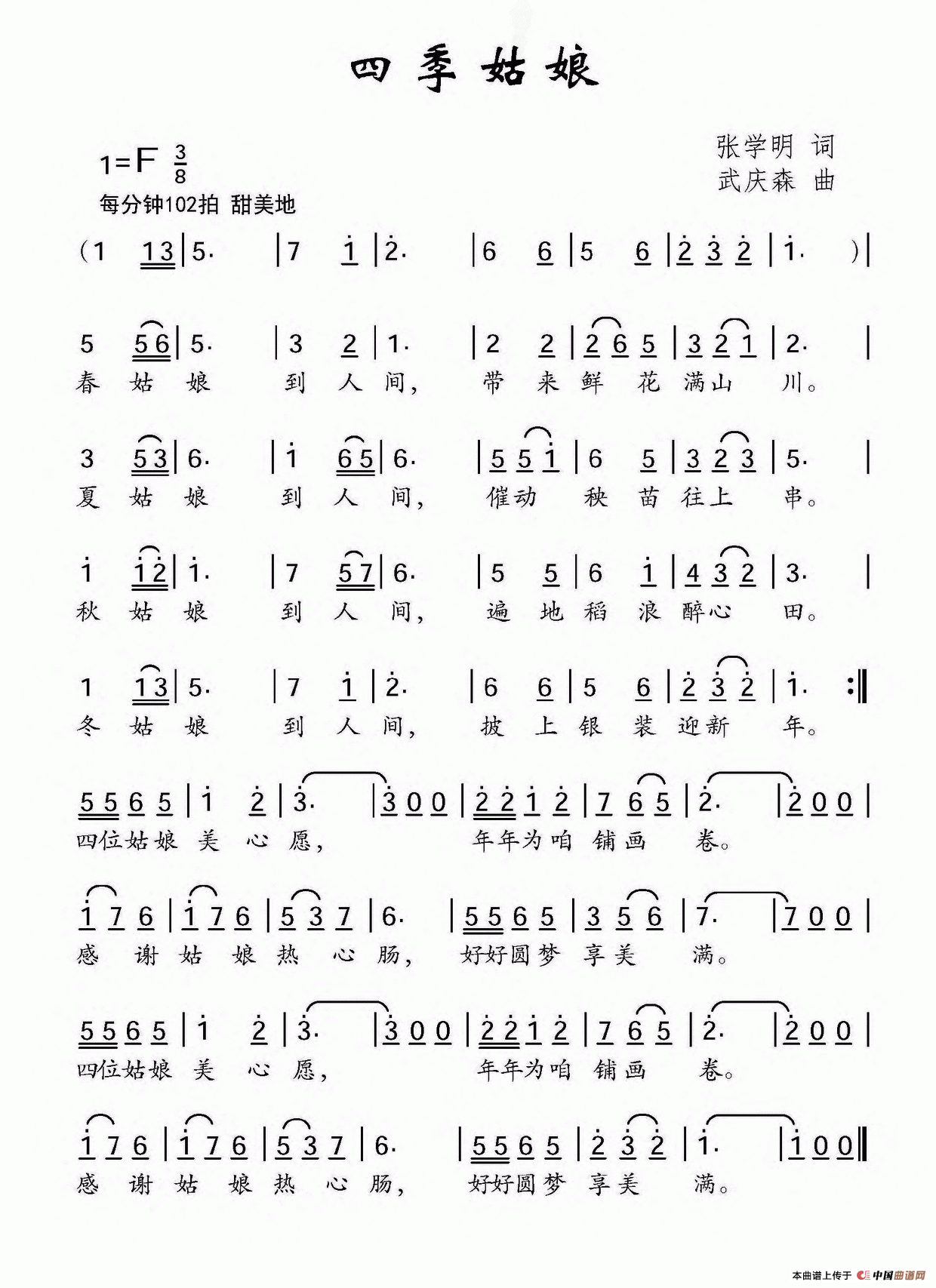 武庆森曲谱推荐要快乐(车行词 武庆森曲)多又多爱草原(董宪瑞词 武庆森曲)赏樱花高原的精灵节日歌美好的梦(胡敦骅词 武庆森曲)小雨滴(李如会词 武庆森曲)别问我是谁(刘秉刚词 武庆森曲)摇小船(胡敦骅词 武庆森曲)把美丽留下(刘志毅词 武庆森曲)报鸭名小辣椒中国梦·百姓情好漂亮的红蜻蜓(金本词 武庆森曲)黄河娃(李涛词 武庆森曲)小宝贝(阿丁词 武庆森曲)秋色挂在屋檐下小“福娃”(程宏明词 武庆森曲)彩虹(张宾普词 武庆森曲)