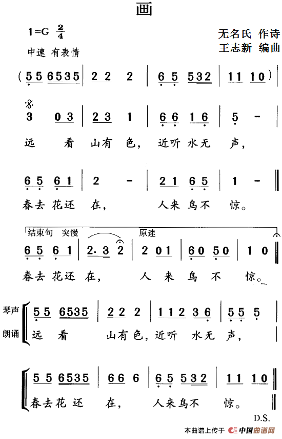王志新编曲曲谱推荐古诗词今唱:秋浦歌古诗词今唱:咏柳古诗词今唱:马(齐唱、合唱)古诗词今唱:陶者古诗词今唱:九月九日忆山东兄弟古诗词今唱:塞下曲古诗词今唱:观沧海古诗词今唱:春夜喜雨古诗词今唱:江上渔者古诗词今唱:秋夕古诗词今唱:别董大(齐唱、合唱)古诗词今唱:竹里馆古诗词今唱:长歌行古诗词今唱:游园不值古诗词今唱:题西林壁古诗词今唱:回乡偶书古诗词今唱:左迁至蓝关示侄孙湘古诗词今唱:早发白帝城古诗词今唱:清明古诗词今唱:渔家傲
