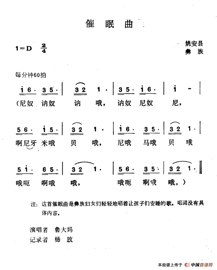 催眠曲(云南姚安县彝族民歌)相关五线谱