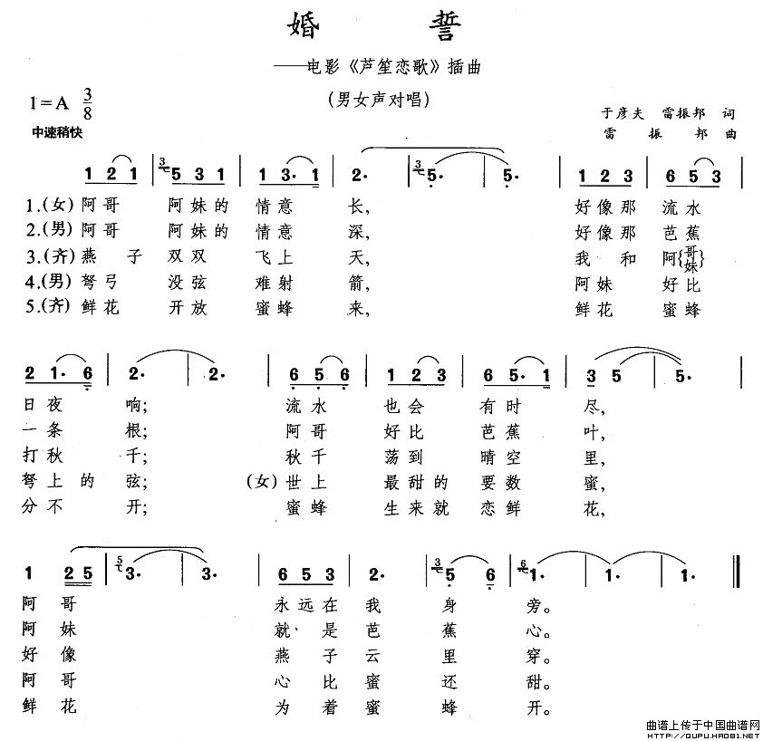 雷振邦曲谱推荐冰山上的雪莲(电影《冰山上的来客》插曲)世上哪见树缠藤(电影《刘三姐》选曲)小小鲤鱼不吞钩(电影《刘三姐》选曲)花儿为什么这样红(电影《冰山上的来客》插曲)冰山上的雪莲婚誓花针引线线穿针(电影《刘三姐》插曲)花儿为什么这样红(电影《冰山上的来客》插曲)冰山上的雪莲(吉他独奏、五线谱)采药山歌赤橙黄绿青蓝紫(故事影片《赤橙黄绿青蓝紫》主题歌)蝴蝶泉边(电影《五朵金花》插曲)怀念战友(电影《冰山上的来客》插曲)夺得一个个丰收年(故事片《战洪图》主题曲)怀念战友对 歌③(歌剧选曲)只有山歌敬亲人(又叫“多谢了”)渔歌(电影《五朵金花》插曲)冰山上的雪莲(老人适用)马兰花开(大阮分谱)