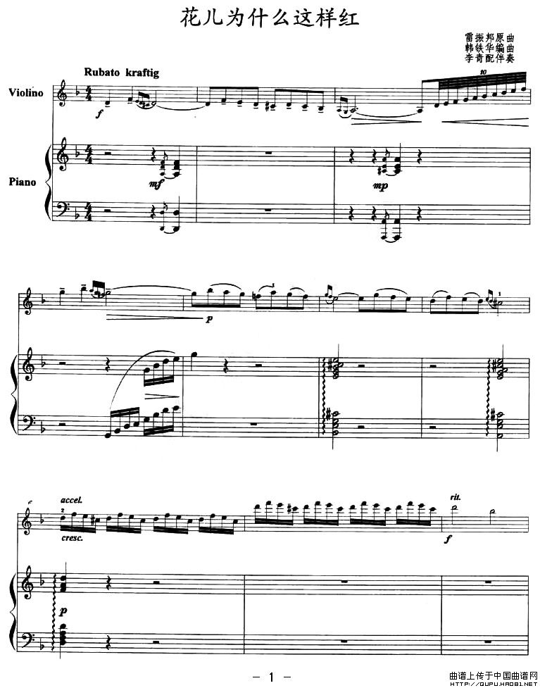 花儿为什么这样红(小提琴+钢琴)相关五线谱