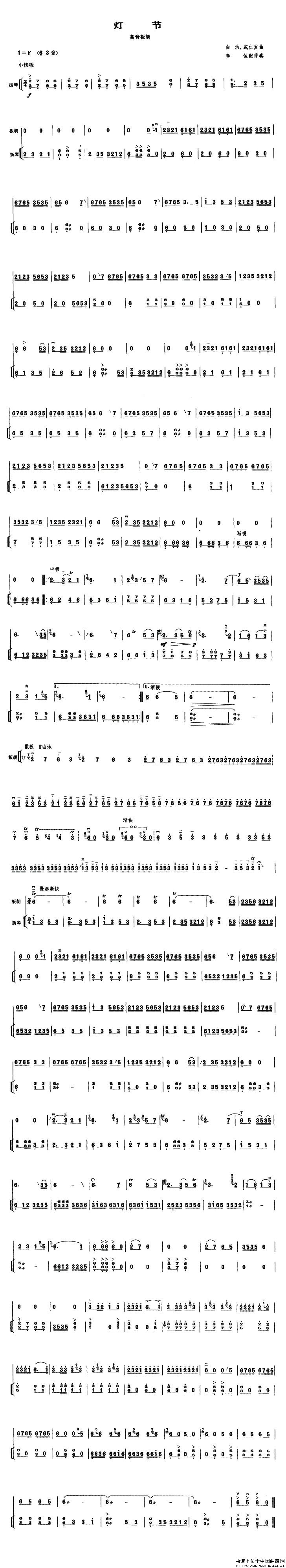 灯节(高音板胡、扬琴伴奏谱)相关五线谱