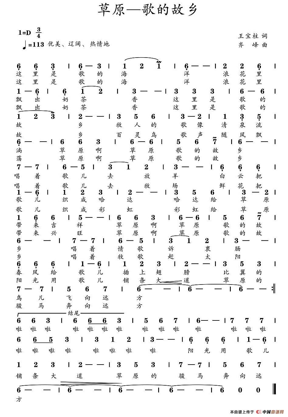 齐峰曲谱推荐我愿意(刘丽萍词 齐峰曲)我爱北疆站在草原唱赞歌消防兵爱在霍林河那片牧场唱首情歌给草原迎着黄河向西部走骏马追风头不回春风来喝彩故事(李小平词 齐峰曲)我给你上天摘月亮草原 我思念的故乡醉人的草原(陈光林词 齐峰曲)火红的青春献给北疆草原中油情(李慧兰 王赞和词 齐峰曲)站在草原唱赞歌建设和谐新家园情满山坡草原的恋歌