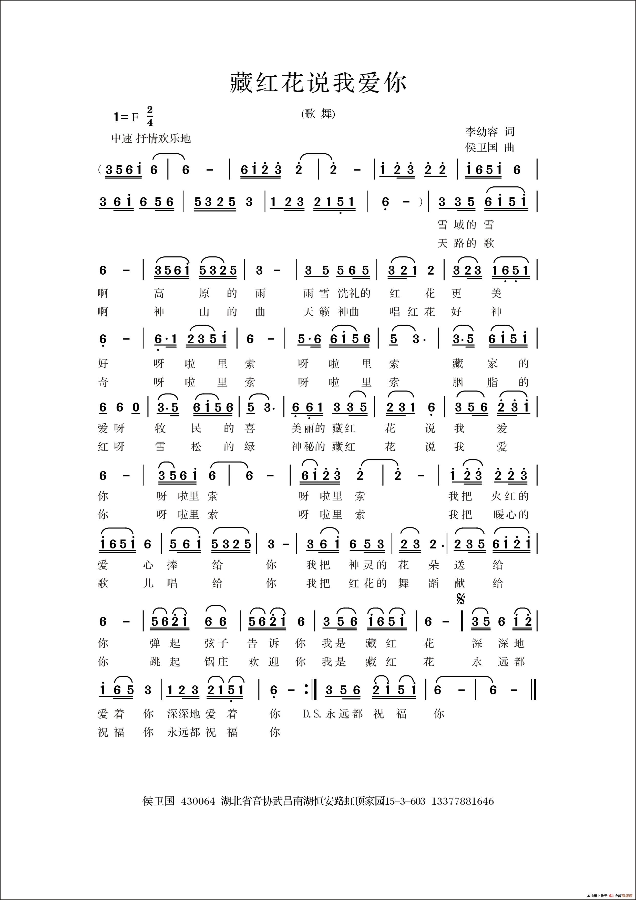 侯卫国曲谱推荐我爱恋的西藏归来(版本一)等 待温情玫瑰痴情的爱(赵金朝词 侯卫国曲)洪湖岸边从小就有当兵梦八声甘州·过赤壁我和你(亚芬词 侯卫国曲)毛泽东,中国符号天上人间(A版) (李红林词 侯卫国曲)门前小河钓童年心爱的姑娘双鱼我要去西藏 (乌兰托娅词 侯卫国曲)母校恋歌相约三月江南(瞿晓词 侯卫国曲)和和美美的祖国爱的思恋天空歌