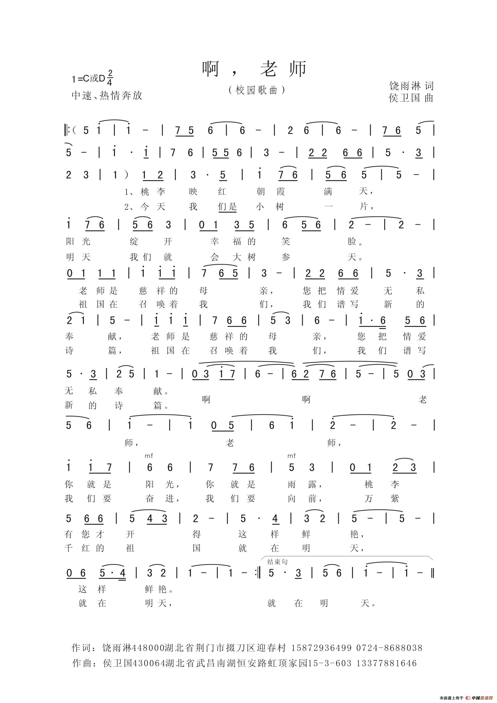 侯卫国曲谱推荐蝶恋花·长相思 新词版草原我向往的地方三沙梦,中国心(李幼容词 侯卫国曲)回家(林红词 侯卫国曲)献给你洁白的哈达美在金华(邬大为、龚正斌词 楼勤、侯卫国曲)枕着月光入眠我爱恋的西藏我爱所爱忠诚(林红词 侯卫国曲)流浪的心(马强词 侯卫国曲)温情玫瑰中秋望月思故乡(瞿晓词 侯卫国曲)磨山脚下荷花香水上学校父亲,中国我的东湖美我的高原我的大山让世界更精彩(徐环宙词 侯卫国曲)一丛花·李先念故居