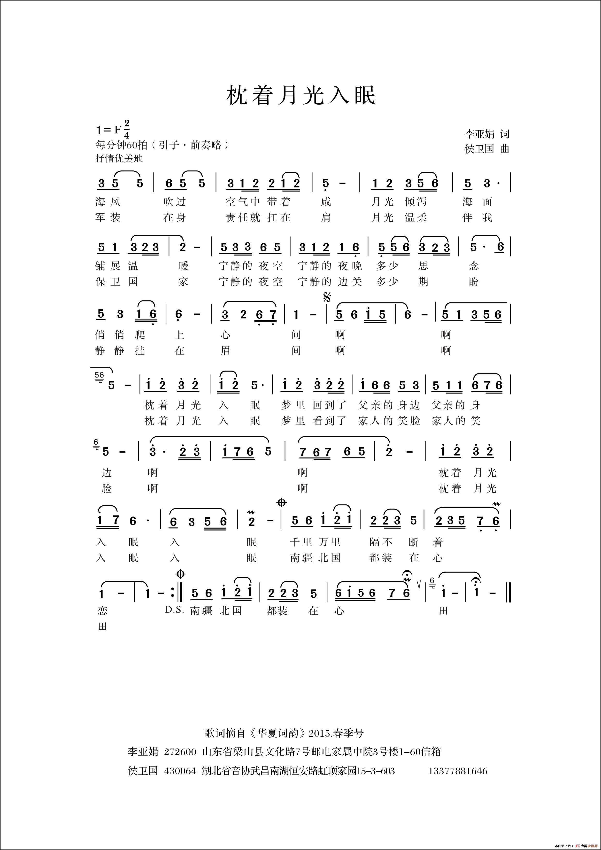 侯卫国曲谱推荐为武汉繁荣喝彩中国旗袍(侯卫国 词曲)米茶谣毛泽东,中国符号相约三月江南(瞿晓词 侯卫国曲)祝福祖国永远吉祥(任英荣词 侯卫国曲)保卫武汉满江红•山河颂福字歌(李亚娟词 侯卫国曲)乡愁(瞿晓词 侯卫国曲)淘气宝归来(龙一民词 侯卫国曲、版本一)水乡周庄乡 情(亚芬词 侯卫国曲)美丽的海南(瞿晓词 侯卫国曲)还是你最好(李幼容词 侯卫国曲)好苹果 (版本二)草原之恋(孔庆武词 侯卫国曲)香格里拉,人间的天堂草原,我的一个家(版本二)