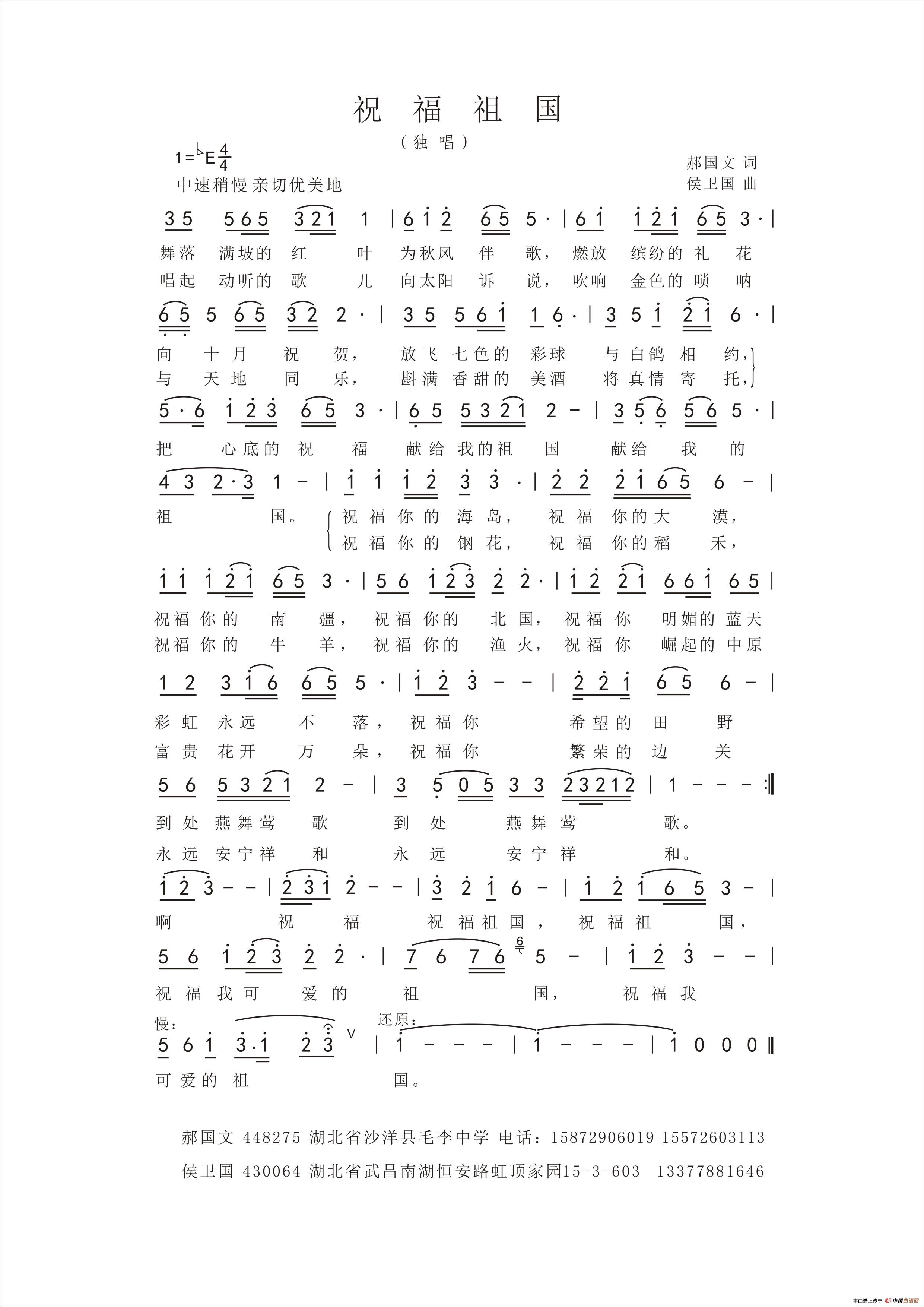 侯卫国曲谱推荐海峡(芮彭年词 侯卫国曲)醉美乡愁(赵金朝词 侯卫国曲)有爱的世界啊,老师(饶雨淋词 侯卫国曲)醉爱陕西我的家望月(何 也词 侯卫国曲)邀请你到新疆来城市的大街闪动着桔红两个月亮(何也词 凌子 侯卫国曲)两岸梦(李晓军词 侯卫国曲)忠诚(林红词 侯卫国曲)相约三月江南(瞿晓词 侯卫国曲)福字歌(李亚娟词 侯卫国曲)让世界更精彩(徐环宙词 侯卫国曲)爱的思恋美丽的格尔木你是我吉祥的云望故乡(郝国文词 侯卫国曲)东方的丰碑(李幼容词 侯卫国曲)我和你(亚芬词 侯卫国曲)