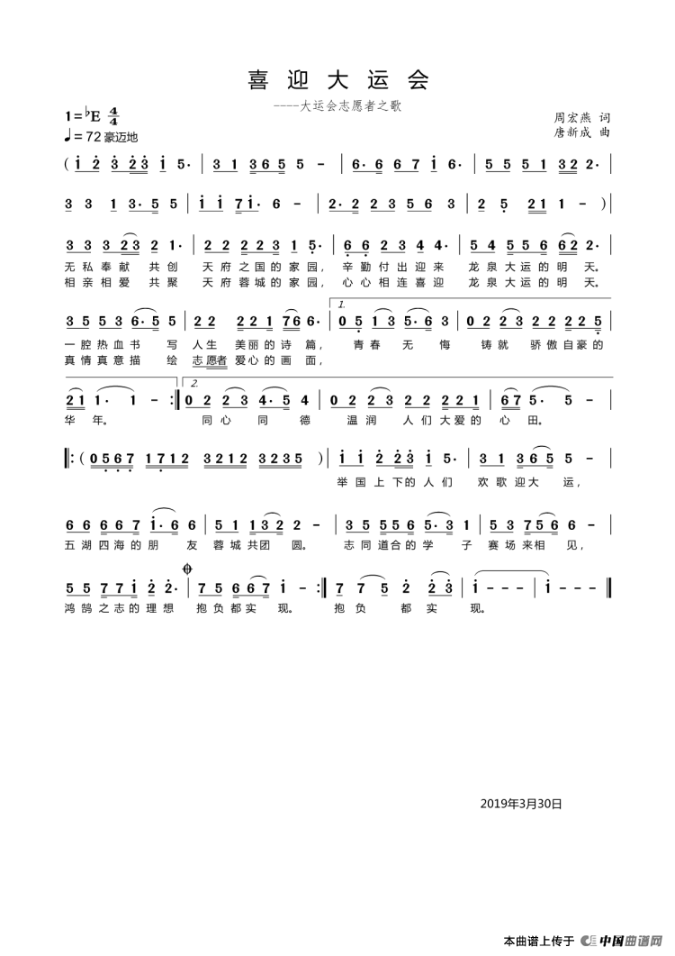 喜迎大运会(作词:周宏燕(衡阳) 作曲:唐新成(淮南))相关五线谱