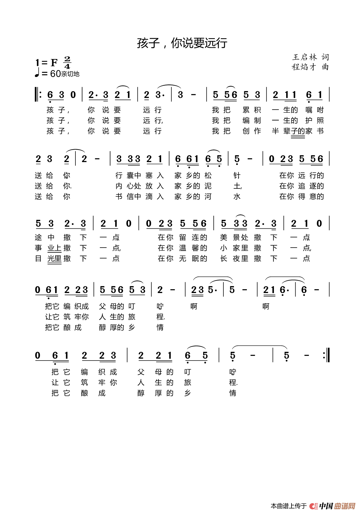 孩子,你说要远行相关五线谱