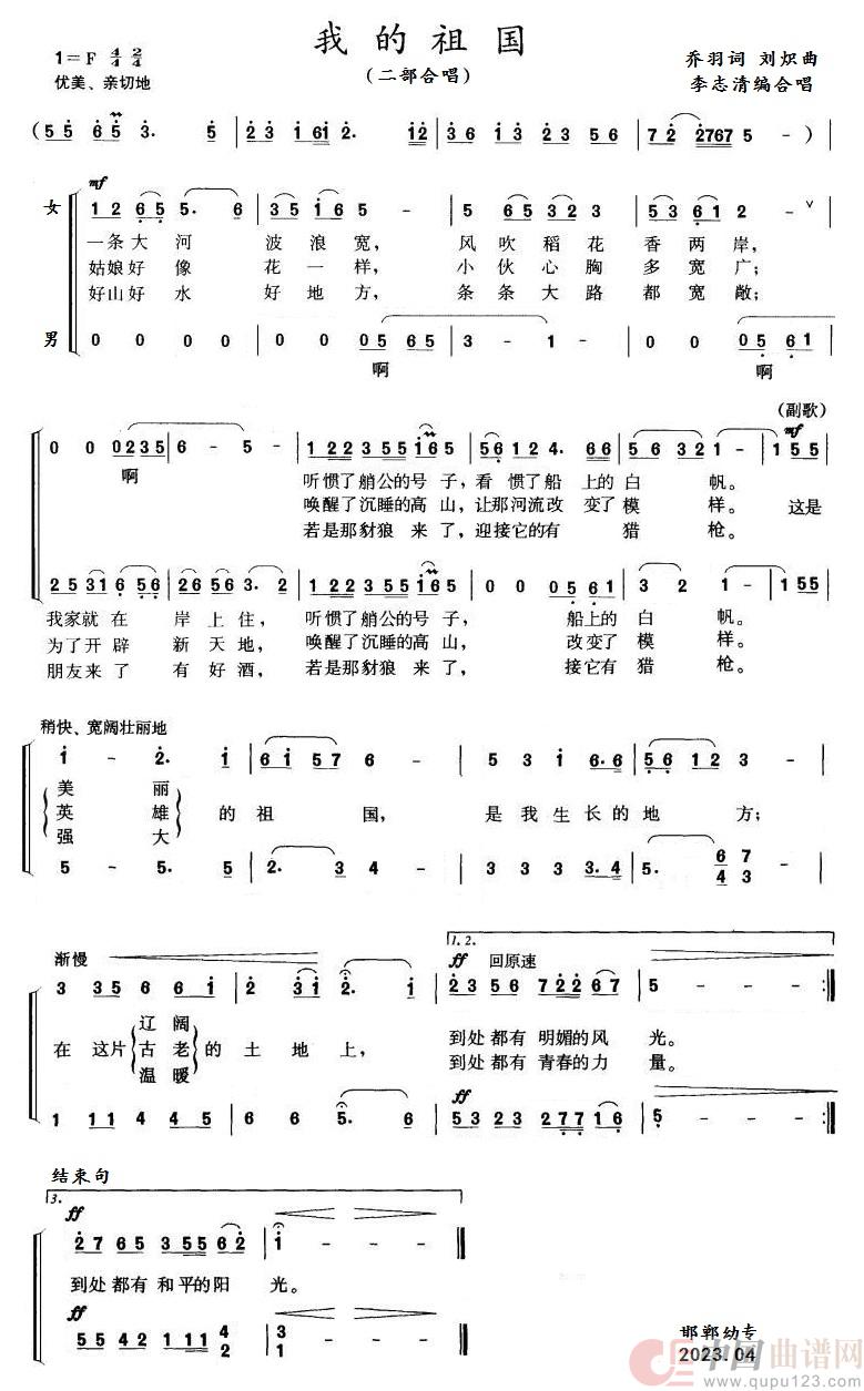 刘炽曲谱推荐祖国颂(乔羽词 刘炽曲、合唱)我的祖国宁夏川(安妮词 刘炽曲)芳草绿遍了天涯让我们荡起双桨(合唱)我的祖国1,2红旗指向大渡河(电影《大渡河》插曲)荷花颂(混声无伴奏合唱)(程若词 刘炽曲)我的祖国(电影《上甘岭》插曲)新疆好(梦之旅组合)新疆好我的祖国(领唱+混声四部合唱)交响大合唱·祖国三部曲:祖国颂(钢琴伴奏谱)新疆好(混声四部合唱)新疆好歌剧《白毛女》全剧之第七十六曲(五幕三场)儿童进行曲荷花颂(完整版)那怕它黄河之水天上来(大合唱《祖国颂》选段)我的祖国(管乐合成分谱)