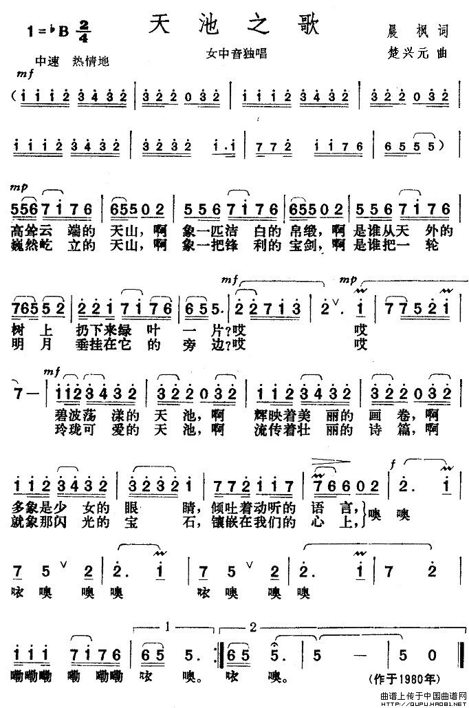 楚兴元曲谱推荐玉山,我把你怀念向生命远方飞翔(任务记录片《华人传奇》片尾曲)我是一枚小海螺告别(晨枫改词 楚兴元曲)祖国的春天来了故乡的小路(许德请词 楚兴元曲)雪域哨卡放心吧!姑娘剪窗花(任志萍词 楚兴元、董长武曲)祖国感谢你们洗衣裳(晨枫词 楚兴元曲)牧马姑娘焦裕禄,我们怀念你(中央电视台《金锁、银锁》晚会曲目)鸟岛军歌金曲:哥哥要当兵走我爱祖国(鲍和平词 楚兴元曲)过去的事情就让它过去国防生之歌天马的故乡雪花落在军装上(吕雄文、天骄原词 楚兴元改词作曲)
