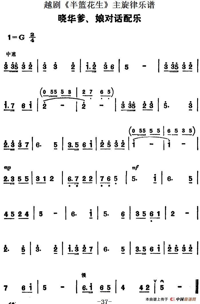 越剧《半篮花生》全剧主旋律乐谱:晓华爹、娘对话配乐(P37)相关五线谱