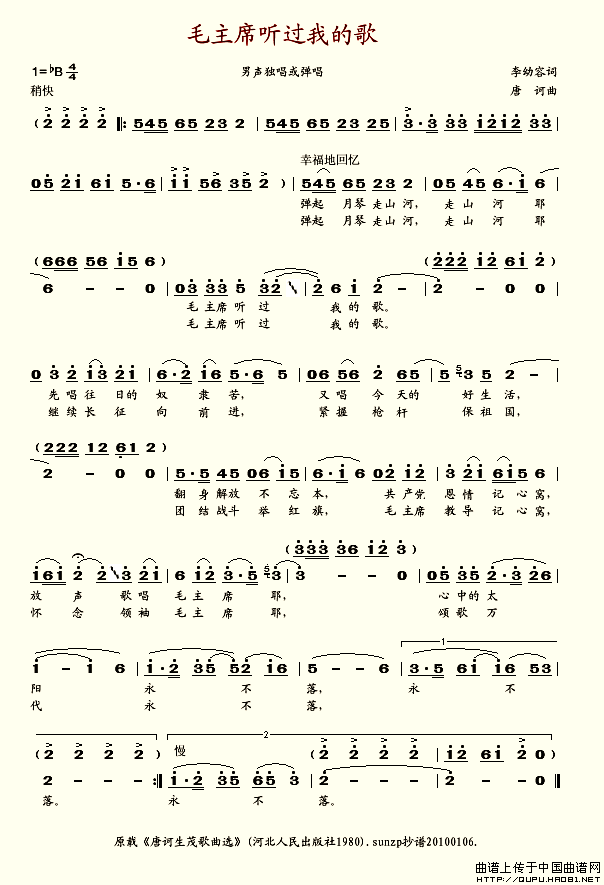 唐诃曲谱推荐中国新歌多(常春成词 唐诃曲)最美最美是中华(倪维德词 唐诃曲)牡丹之歌雪(《沁园春》)飞越大渡河(长征组歌《红军不怕远征难》之五)沁园春 雪到吴起镇(长征组歌《红军不怕远征难)之七)红飘带,飘起来(放歌长征路)祖国,祖国,我爱你(洪源词 唐诃曲、合唱)沁园春雪老房东查铺(知青50周年专辑)唱不尽的胜利歌我们的生活充满阳光(电影《甜蜜的事业》插曲)向红军爷爷表心怀歌唱民族大团结(李幼容词 唐诃曲)我们的明天比蜜甜(二重奏)雪中的北海窗口的蔷薇花祝捷(长征组歌《红军不怕远征难》之八)过雪山草地(长征组歌《红军不怕远征难》之六)