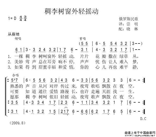 稠李树窗外轻摇动(俄)相关五线谱