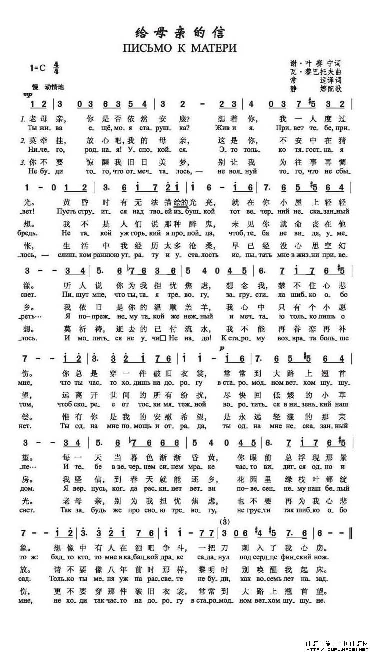 给母亲的信(俄)相关五线谱