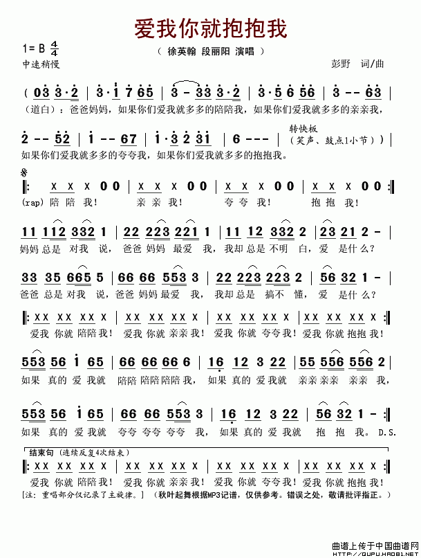 彭野曲谱推荐愚公移山(彭野词曲)我很快乐(线、简谱混排版)谢谢你的爱(吉他六线谱)爸爸好(彭野词曲、线简谱混排版)三字经—高曾祖妈妈我要亲亲你三字经—犬守夜好事圆圆(线简谱混排版)我们是好朋友(线、简谱混排版)三字经—曰春夏好梦甜甜爸爸(彭野词曲)爸爸好(彭野词曲、五线谱版)我有一个家(彭野词曲)老师(彭野词 彭野曲)妈妈听我说(彭野 词曲)同一个世界同一个梦想(彭野词曲)孙悟空打妖怪(樊家信词 彭野曲)夸妈妈(线、简谱混排版)我们是好朋友