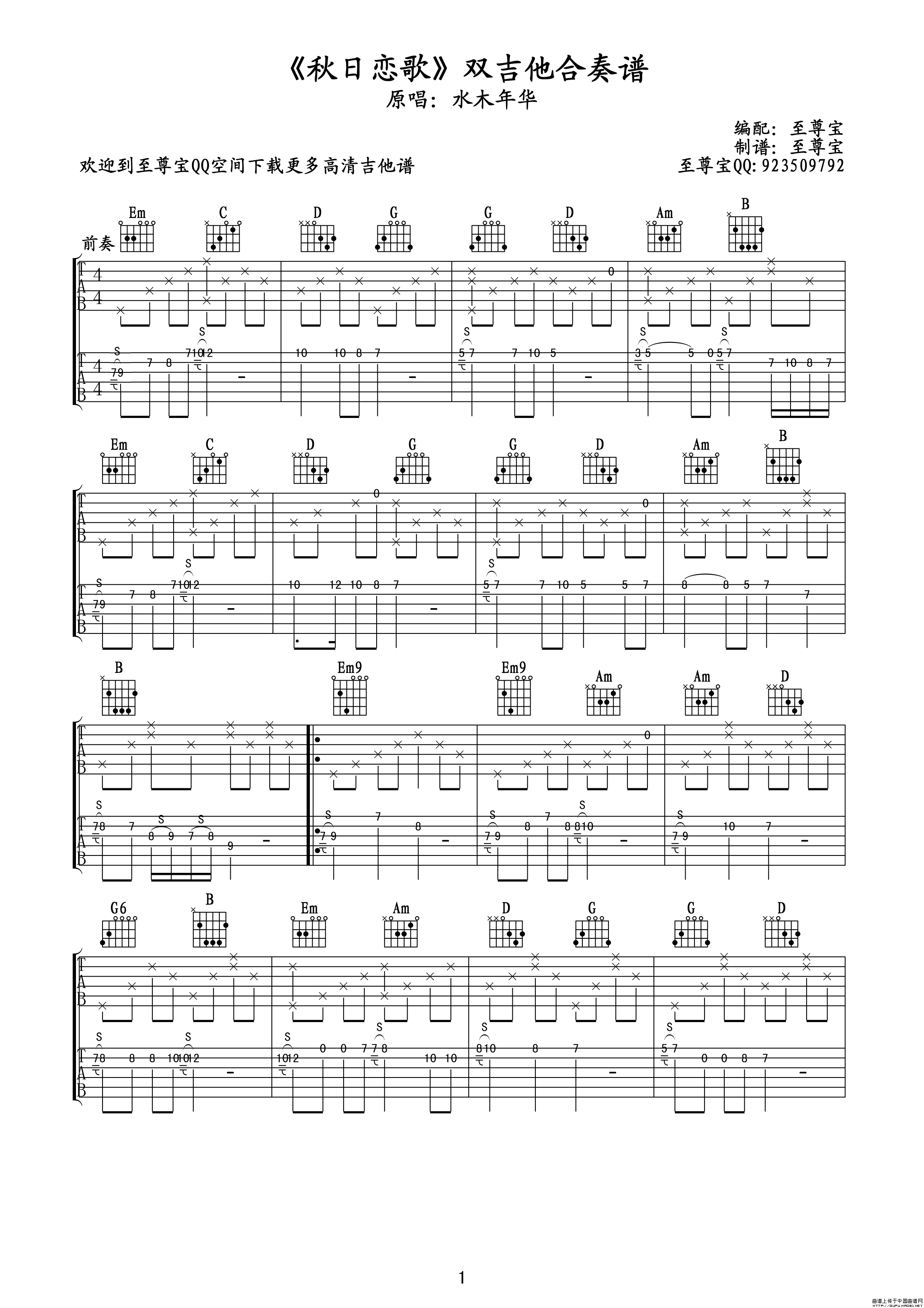 秋日恋歌(双吉他独奏六线谱)