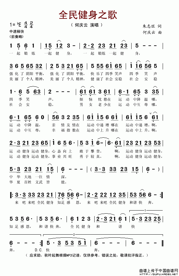 全民健身之歌(朱志旺词 何庆云曲)相关五线谱