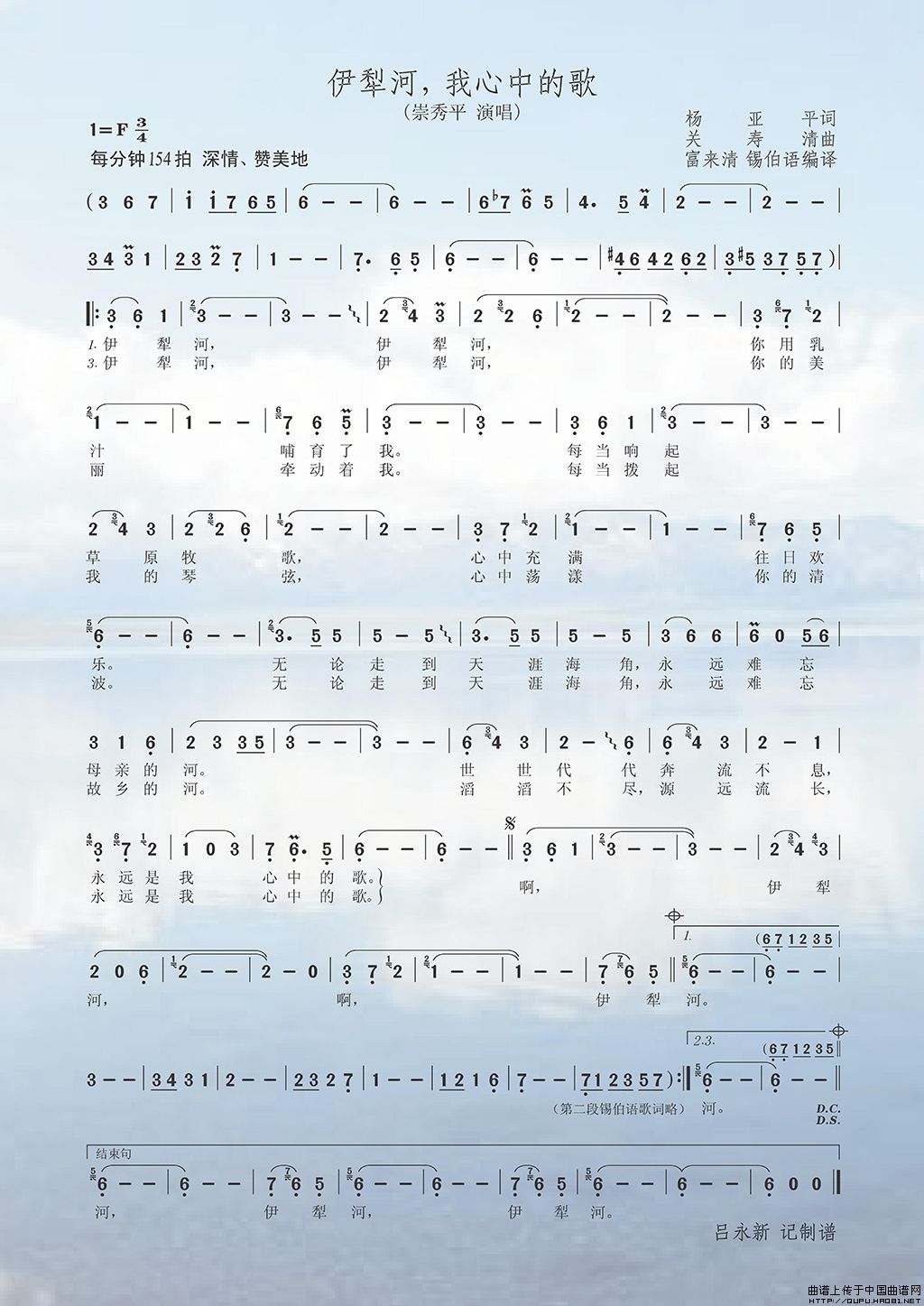 关寿清曲谱推荐俄罗斯姑娘索妮娅(中俄文对照版)欢迎你到那拉提来伊犁河的夜莺我的草原(顾丁昆词 关寿清曲)锡伯族祝酒歌(女声小合唱)大美伊犁(志刚 演唱)祖国啊我爱着你羊角花(魏力兴、魏黎词 关寿清曲)俄罗斯姑娘索妮娅русская девшка Соня(中俄简谱)