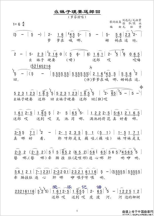 幺妹子硬要送郎回相关五线谱