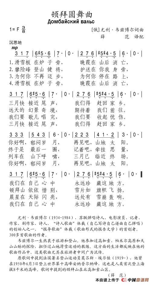 薛范 译配曲谱推荐[日]19点的街[英]仁哉,耶稣![美]你的笑影[前苏联]斯拉夫送行曲(合唱)[俄]歌曲始终伴随人们[美]飞升沼泽士兵之歌(合唱)[美]再不会有这样炽热的爱[美]和动物交谈[美]说我,说你[美]月亮河(电影《蒂凡尼的早餐》主题歌)[美]青鸟飞越多佛尔海峡(合唱)[美]夏夫特[前苏联]斯拉夫送行曲[朝鲜]赤胆红心(歌剧《血海》选曲)[美]闪电舞……好一种感觉[俄] 黑龙江之波(混声合唱、中俄文对照版)[俄]地质队员[前苏联] 海港之夜(三部合唱、中俄文对照)[前苏联]歌唱第聂伯尔河