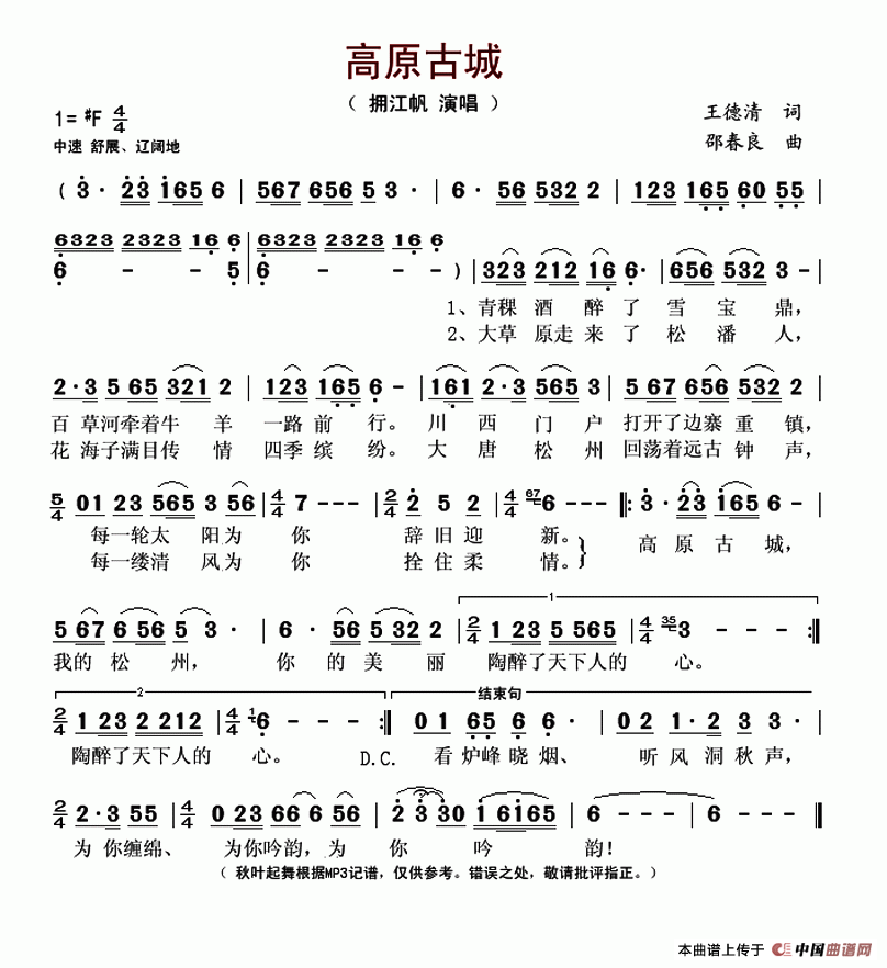 高原古城相关五线谱