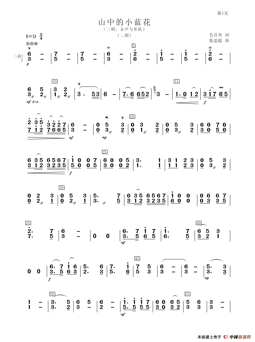 聂思聪曲谱推荐我们共有一个中华(合唱)弹唱新生活山中的小蓝花(二胡、女声与乐队筝分谱)霜叶歌中华,我美丽如花的祖国祖国是各民族和谐的家园西双版纳的天空(组歌)日月星之恋(男女声二重唱)那一眼寄给母亲的明信片绣荷包(民乐合奏、主旋律与二胡)节歌傣乡之夜中国梦之歌(周昆生词 聂思聪曲)尊师重教谣山中的小蓝花(二胡、女声与乐队二胡soLo分谱)那一世,与你相见哈尼姑娘的银铃(民乐合奏)春歌哈尼姑娘的银铃(笛子谱)