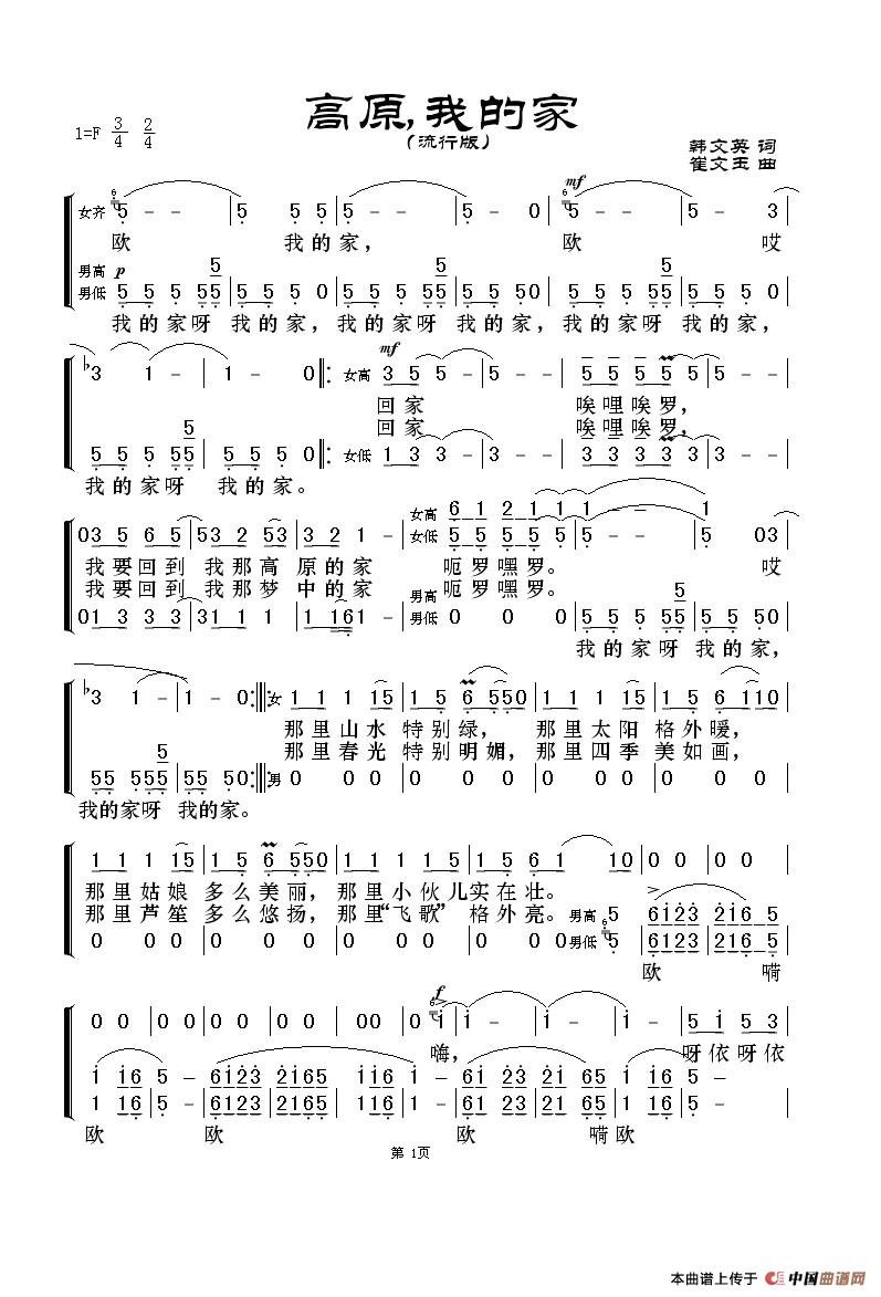 高原,我的家(流行版简谱)相关五线谱