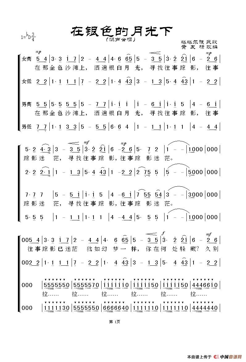 在银色的月光下(黄友棣改编版、四声部合唱 )相关五线谱