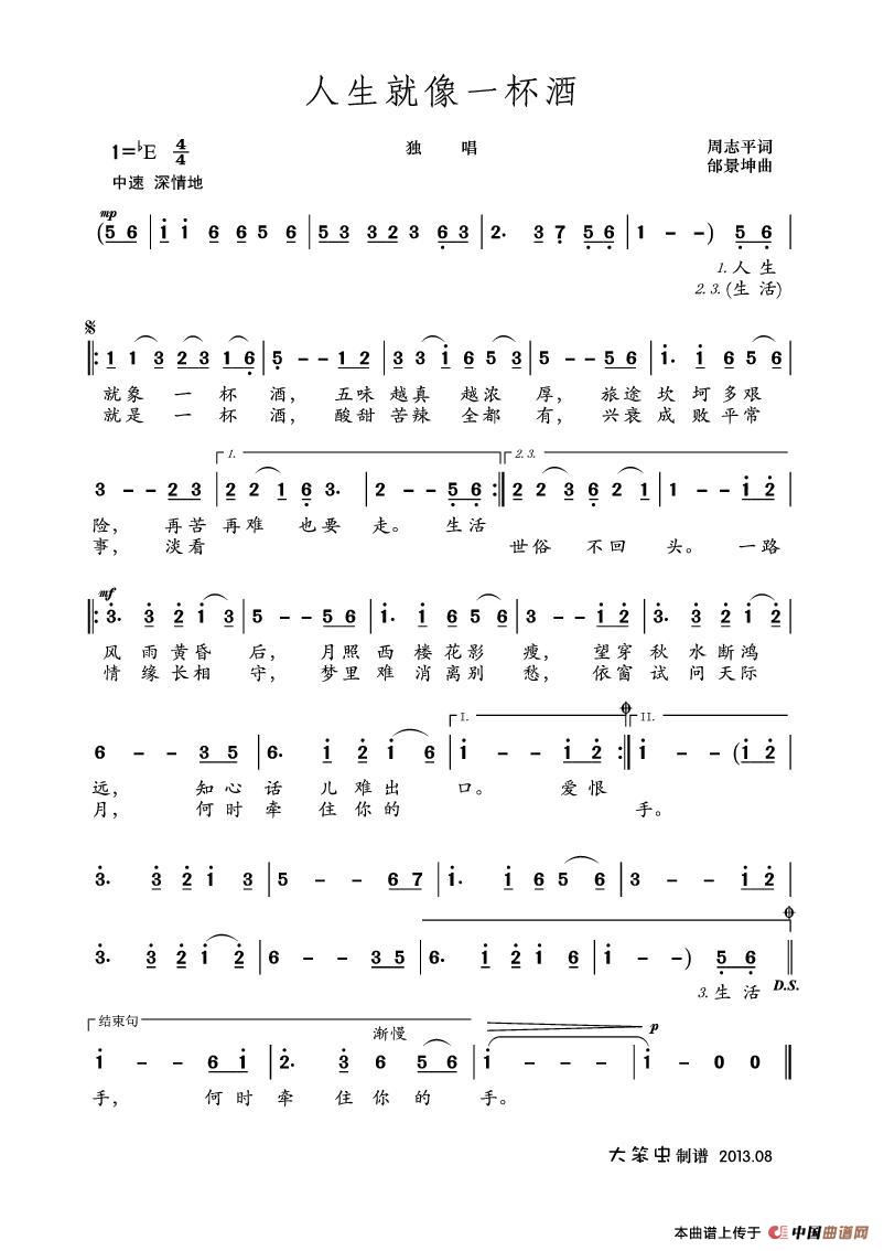 人生就像一杯酒(周志平词 邰景坤曲)相关五线谱