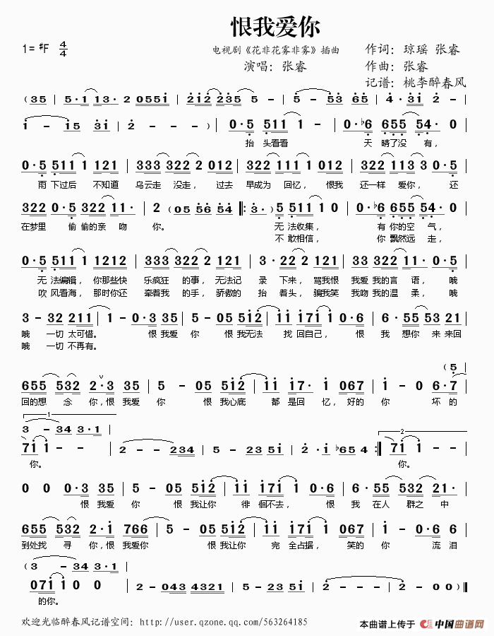 恨我爱你(电视剧《花非花雾非雾》插曲)相关五线谱