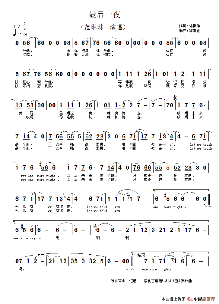 最后一夜相关五线谱