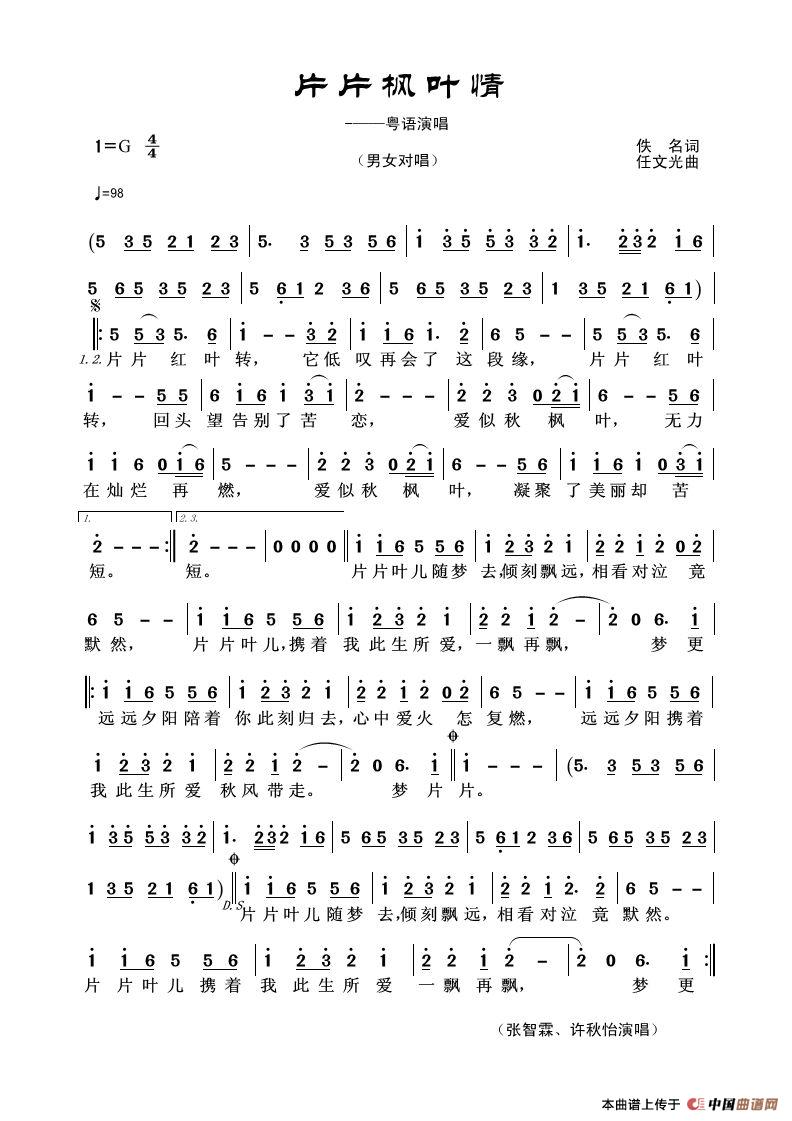 片片枫叶情(佚名词 任文光曲 )相关五线谱