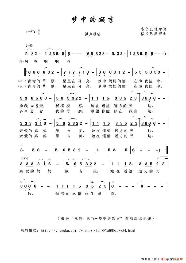 梦中的额吉(布仁巴雅尔词 格拉巴苏荣曲)相关五线谱