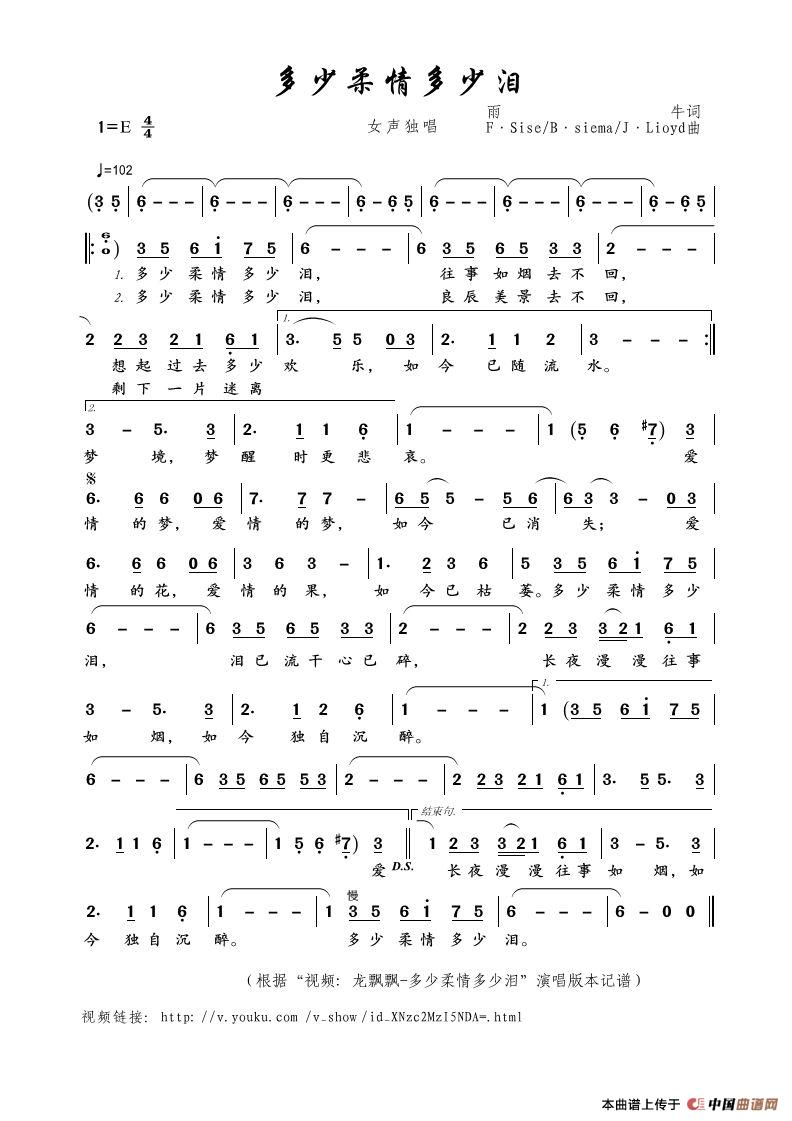 多少柔情多少泪(雨牛词 F·Sise/B·siema/J·Lioyd曲)相关五线谱