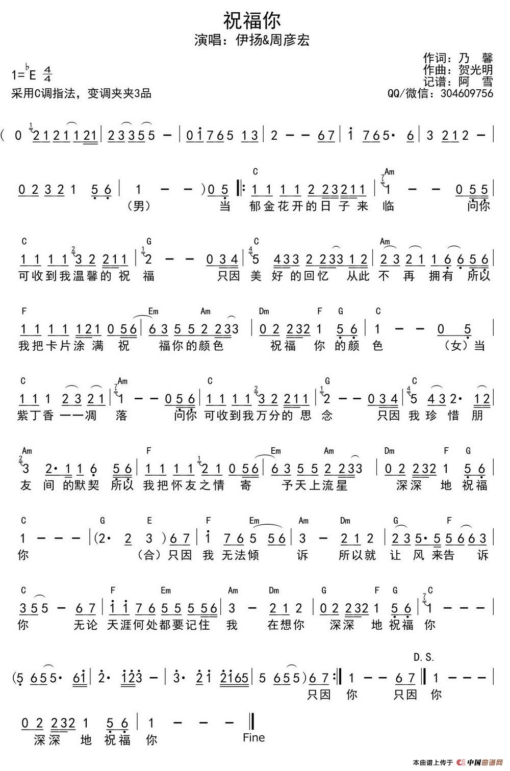 祝福你(乃馨词 贺光明曲)相关五线谱