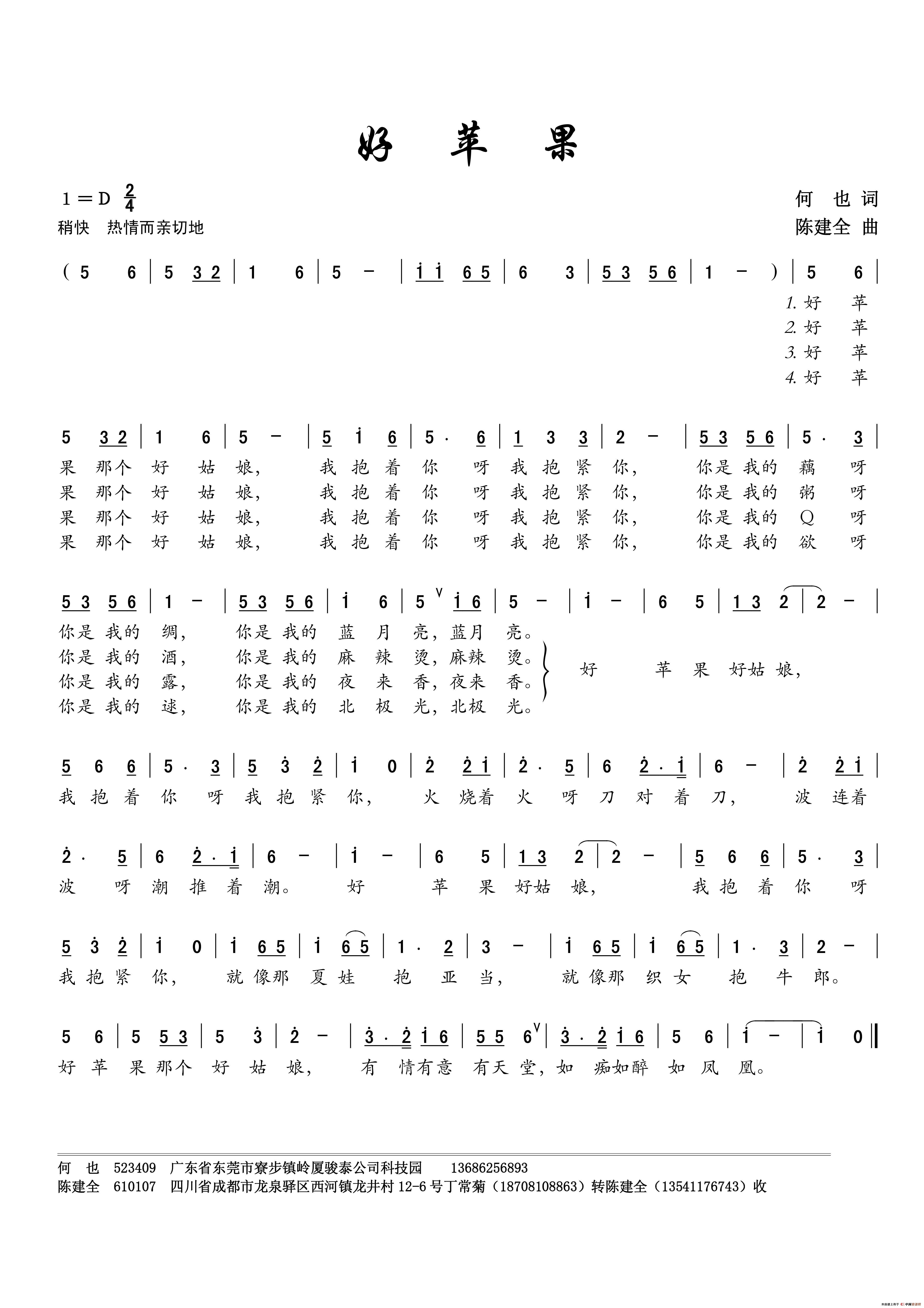 陈建全曲谱推荐有位老人上川洋美(叙事歌曲)大美中国(何也词 陈建全曲、女高音独唱版)战争与和平(何也词 陈建全曲)远方那棵树(何也词 陈建全曲)有一个人(何也词 陈建全曲)总想……林姑娘(何也词 陈建全曲)春暖花开(何也词 陈建全曲)大美中国(何也词 陈建全曲、女中音独唱版)笑比哭好爱你爱你忘记她亲爱的(何也词 陈建全曲)藏歌伴我去西藏你这个人两个月亮(何也词 陈建全曲)水流成河两棵树(何也词 陈建全曲)现代派爱上你不是我的错(何也词 陈建全曲)
