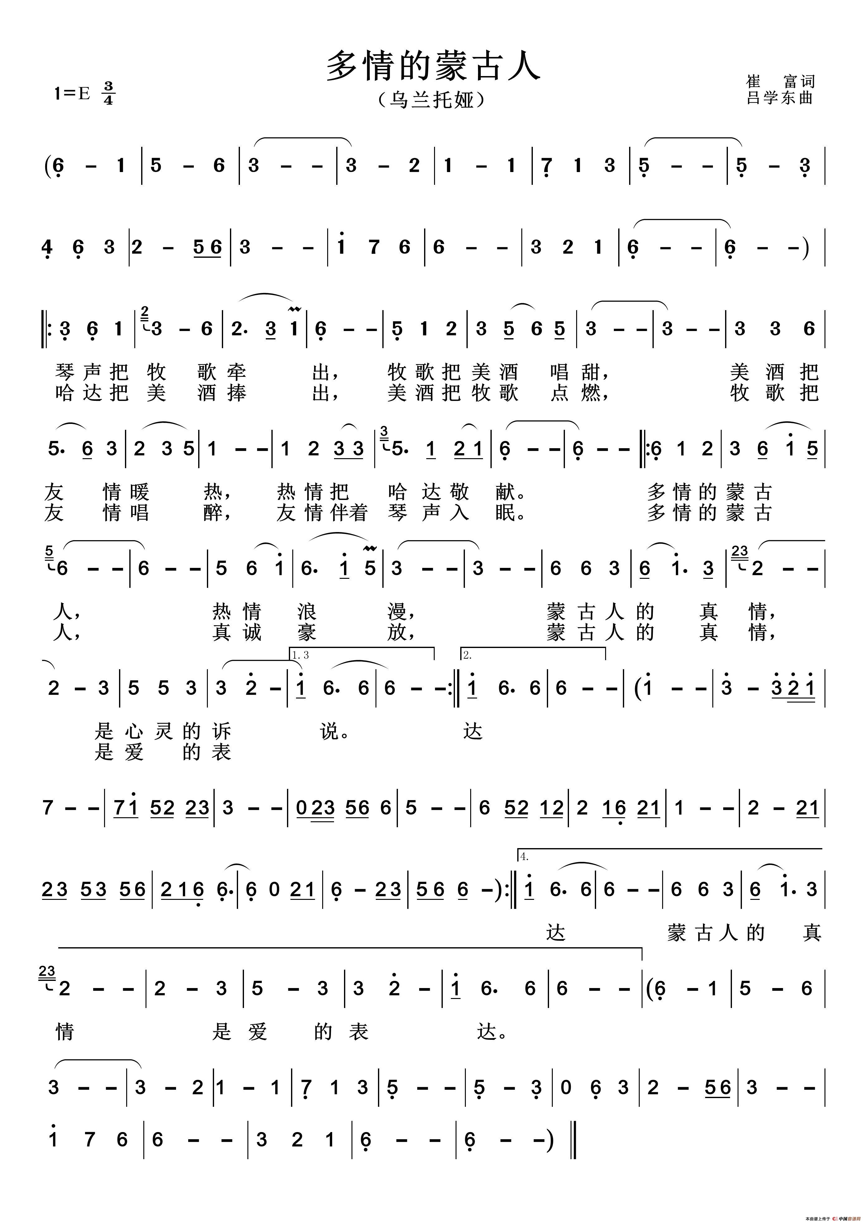 多情的蒙古人相关五线谱