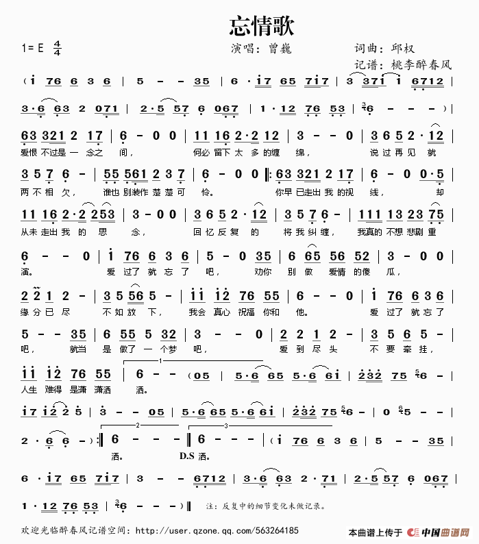 忘情歌相关五线谱